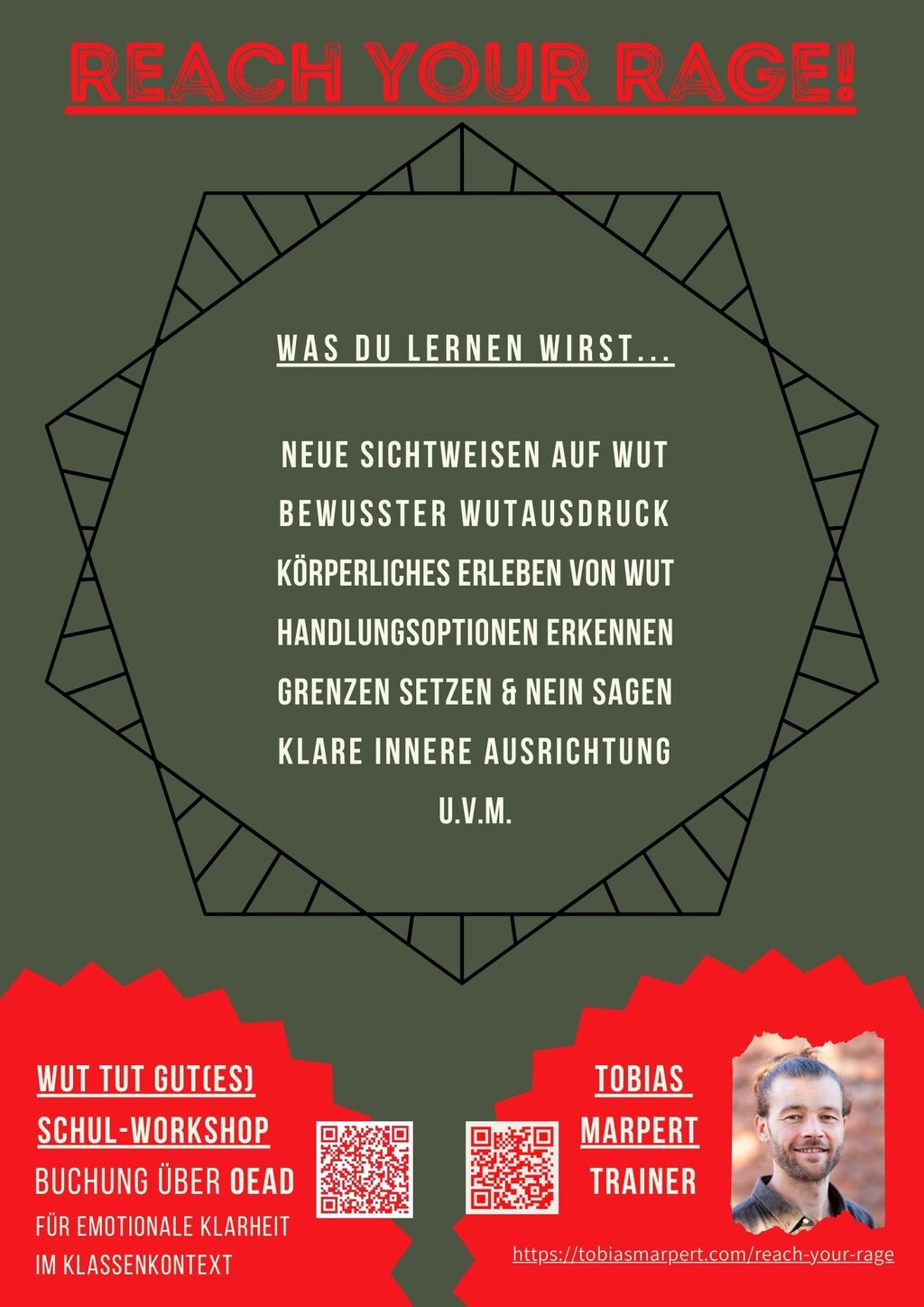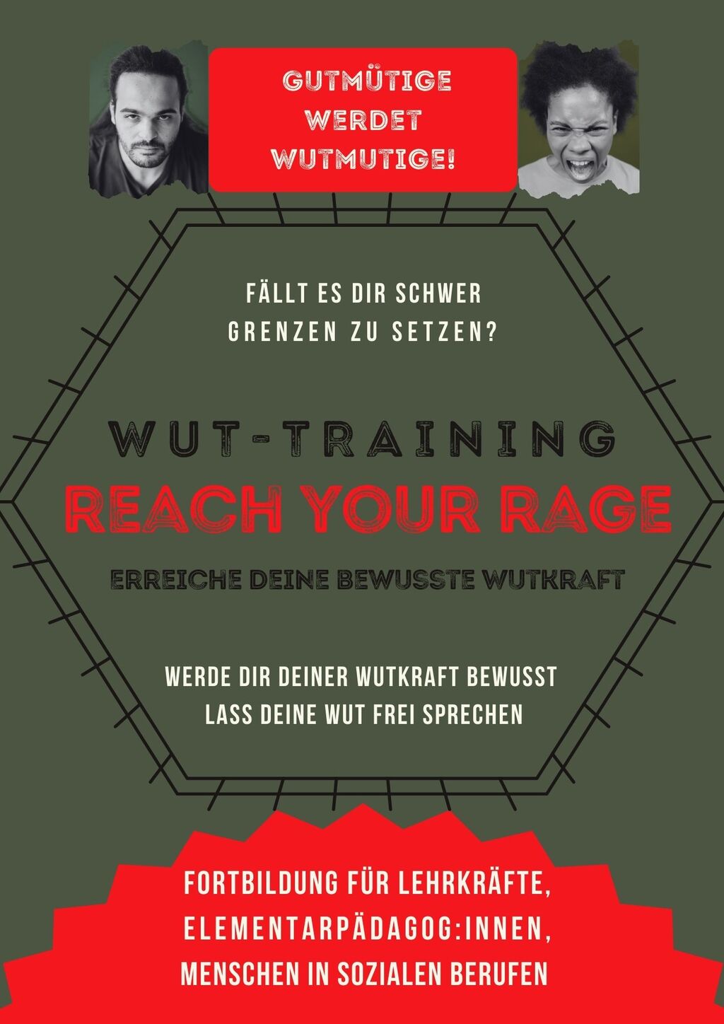 Dann melde dich bei mir für ein REACH YOUR RAGE! Training und ich komme zu euch an eure Bildungseinrichtung, um dort eine Fortbildung zur Wut zu halten.